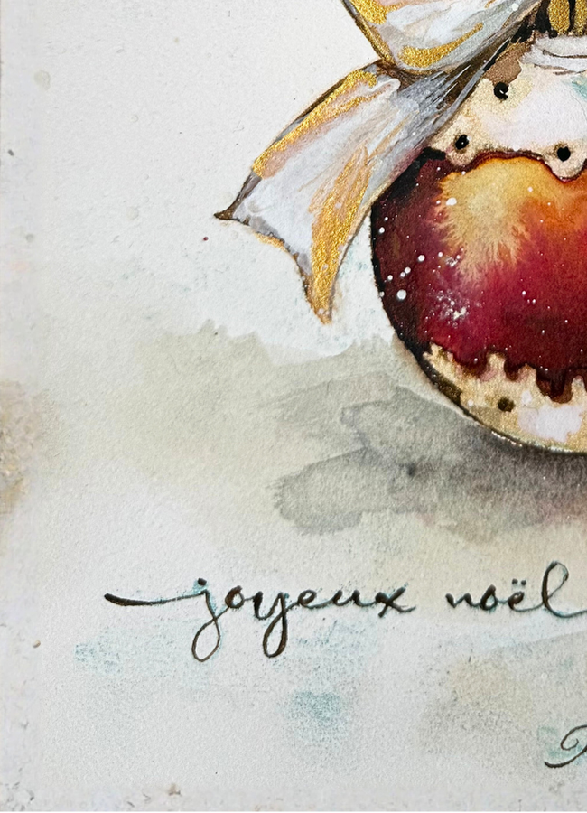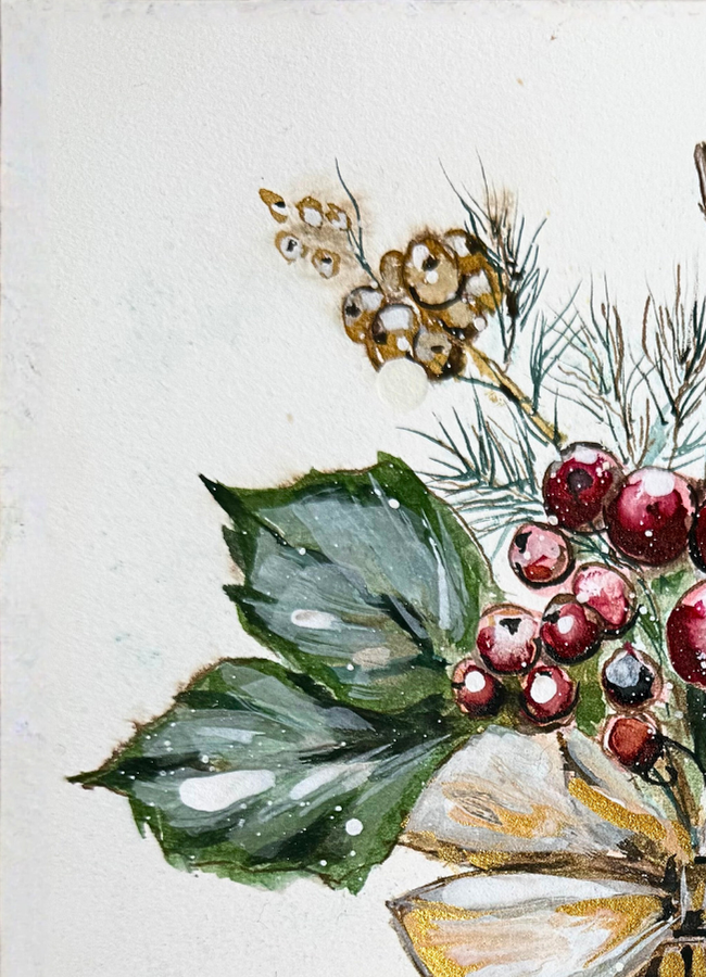 In this delicate mixed media work based on watercolor, Panicha Thisanon reinvents the Christmas ornament as a talisman of gentleness and rebirth. The warm, luminous red bauble becomes a small, enclosed world where the nuances of the cold season settle. It cradles a bouquet of scarlet berries, glossy leaves, and pine branches, all symbols of abundance, protection, and hope.
