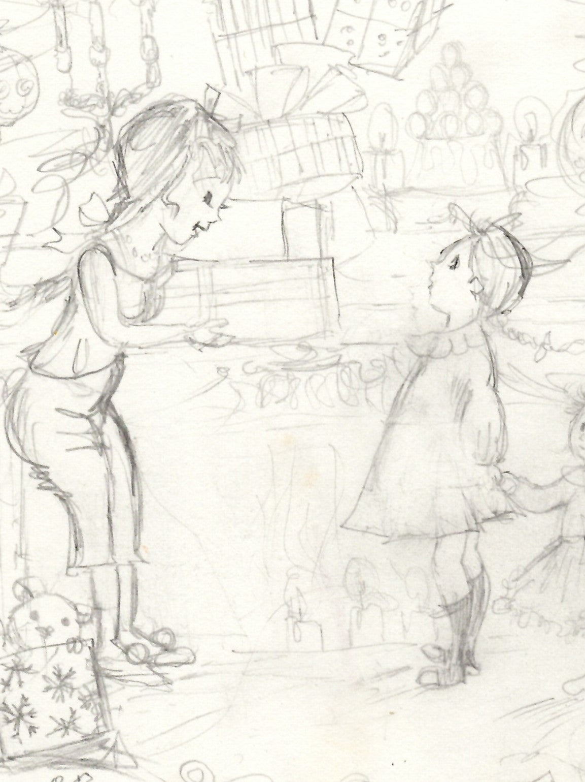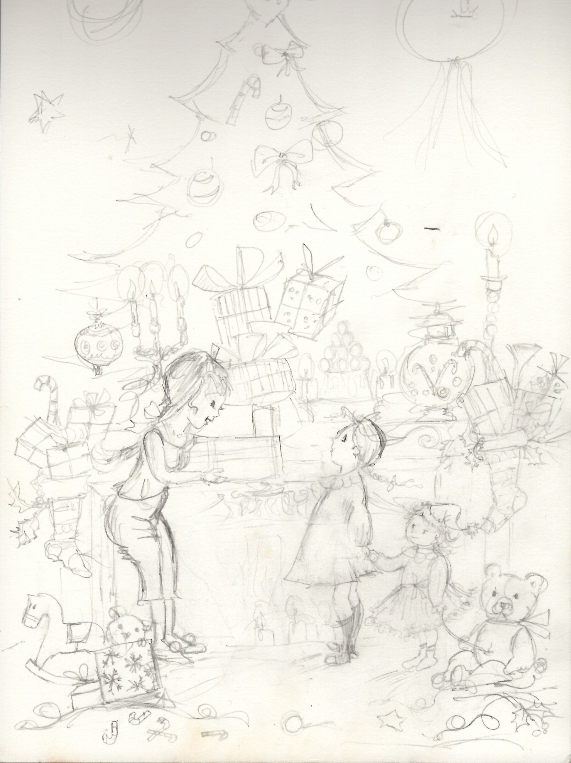 With sketched pencil lines and sensitivity to light, the artist captures an intimate family moment: a mother and her children surrounded by gifts, decoration and festive excitement. The illustration depicts the pure joy and wonder of children, their eyes full of stars, at the promise of Christmas morning.