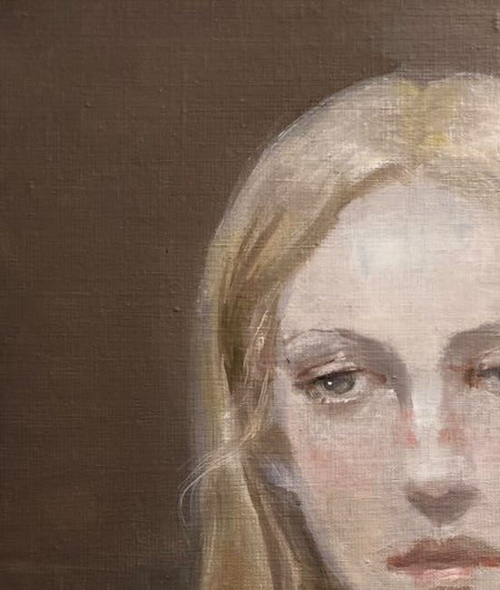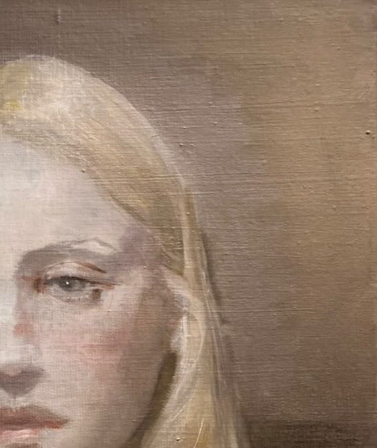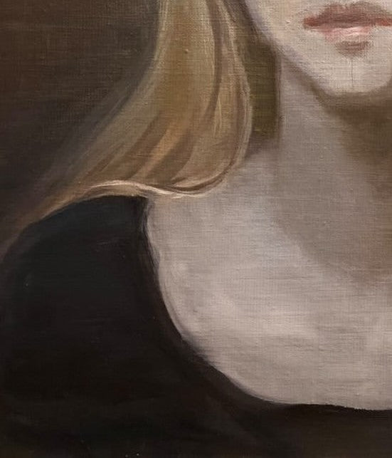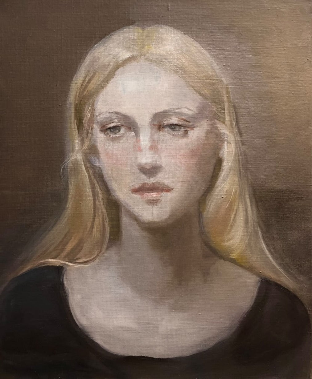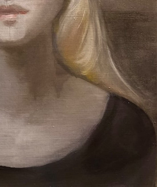 The subdued palette-soft greys, earthy browns, and faint blush tones-envelops the figure in an atmosphere of hushed introspection. Her expression, at once stoic and tender, offers no clear narrative but instead invites the viewer to linger in the ambiguity of feeling, in the unresolved space between melancholy and grace.