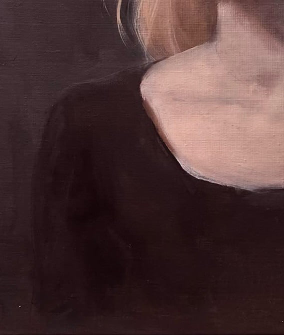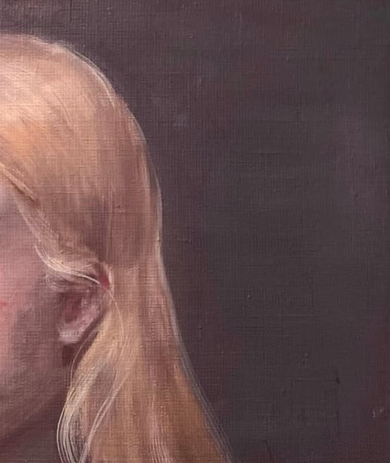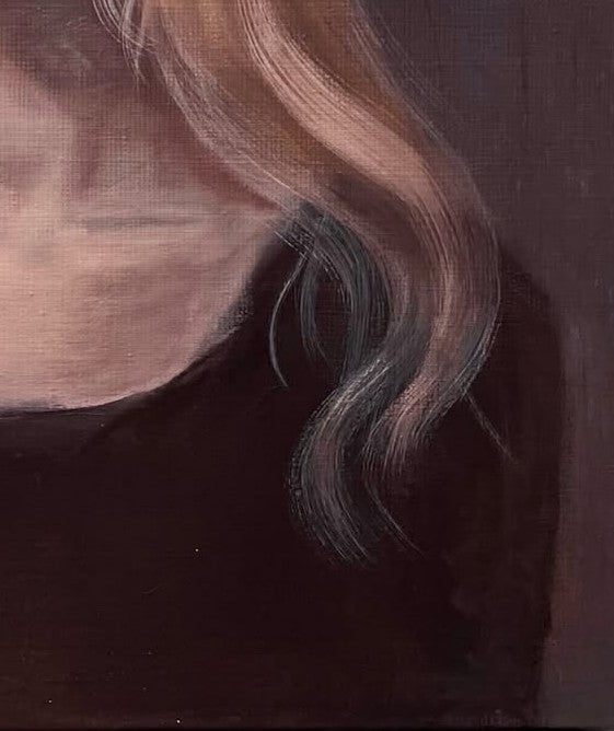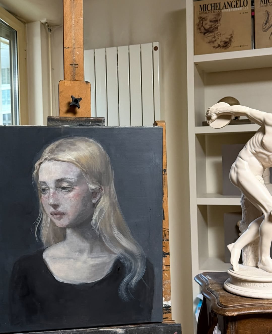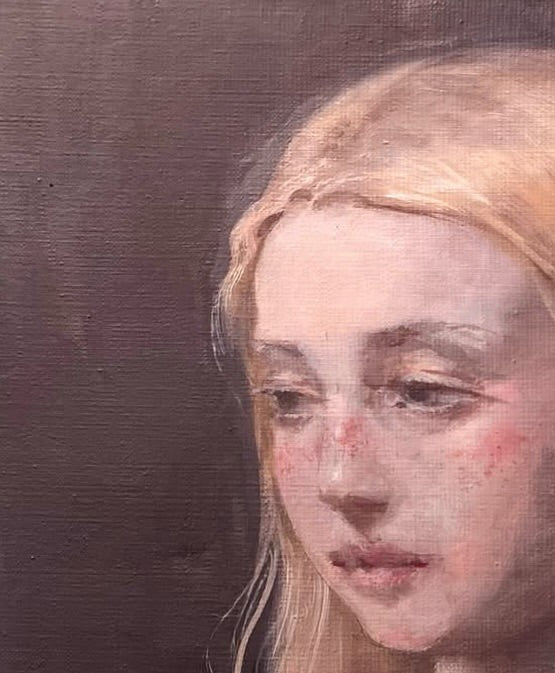 With her delicate complexion, flushed cheeks, and gentle downward gaze, the subject appears caught in a moment of silent reverie. Panicha masterfully employs the traditional academic technique of grisaille, a monochromatic underpainting used by Renaissance masters to establish form and value before applying color. This layered approach creates a sense of sculptural volume and timeless elegance in the rendering of the face and figure.