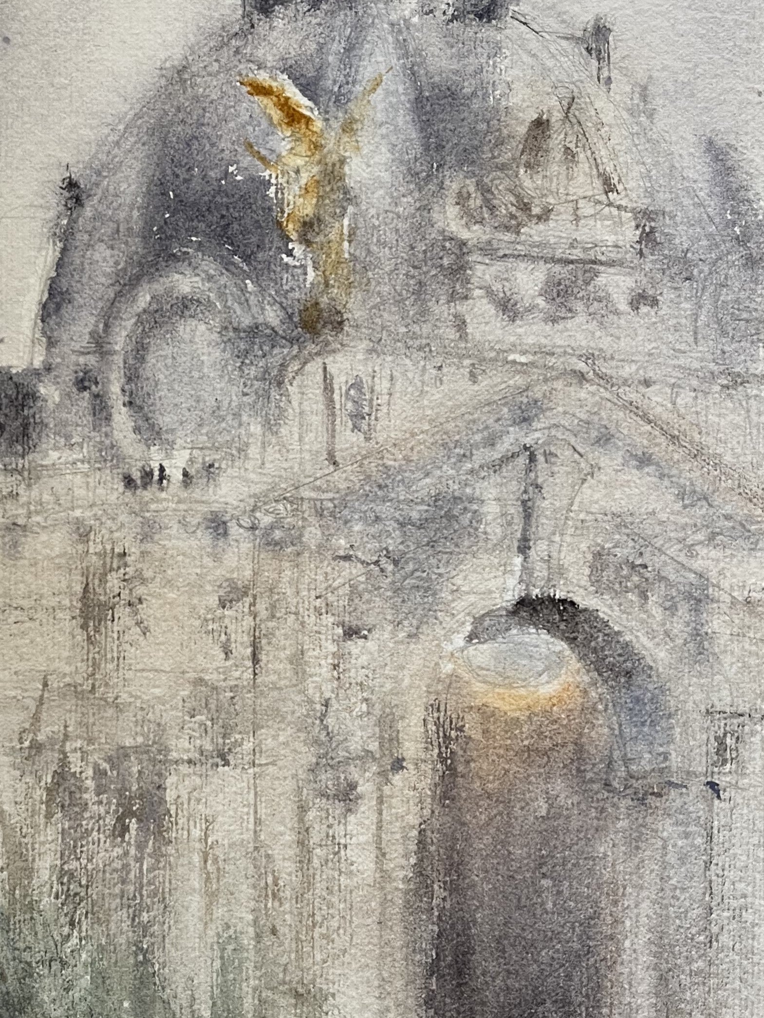 The artist's delicate use of watercolor transposes the building into an almost dreamlike dimension, where the architectural forms gently blend into the cottony atmosphere of the sky.