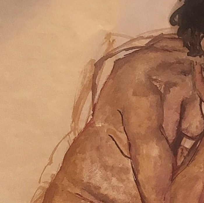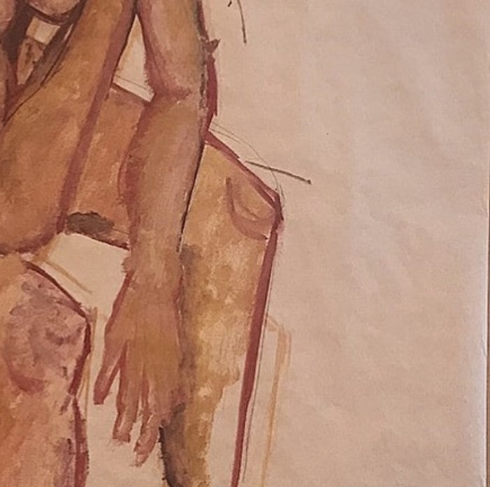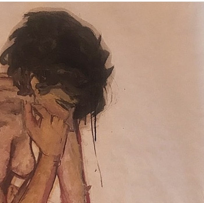 The warm colors which envelop the body and the shadows which outline its contours convey an intimate and meditative atmosphere. The figure, isolated and absorbed in thought, seems to carry the weight of an intense personal experience or painful introspection.