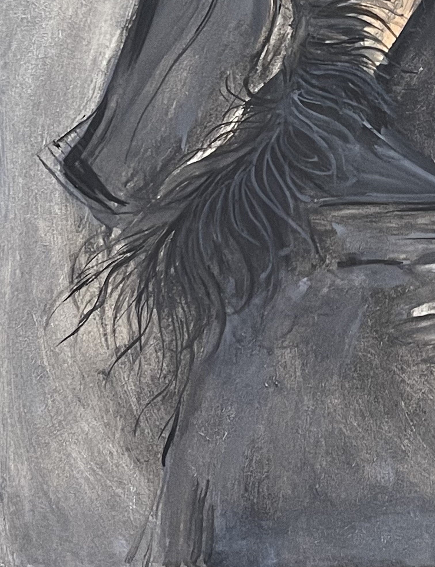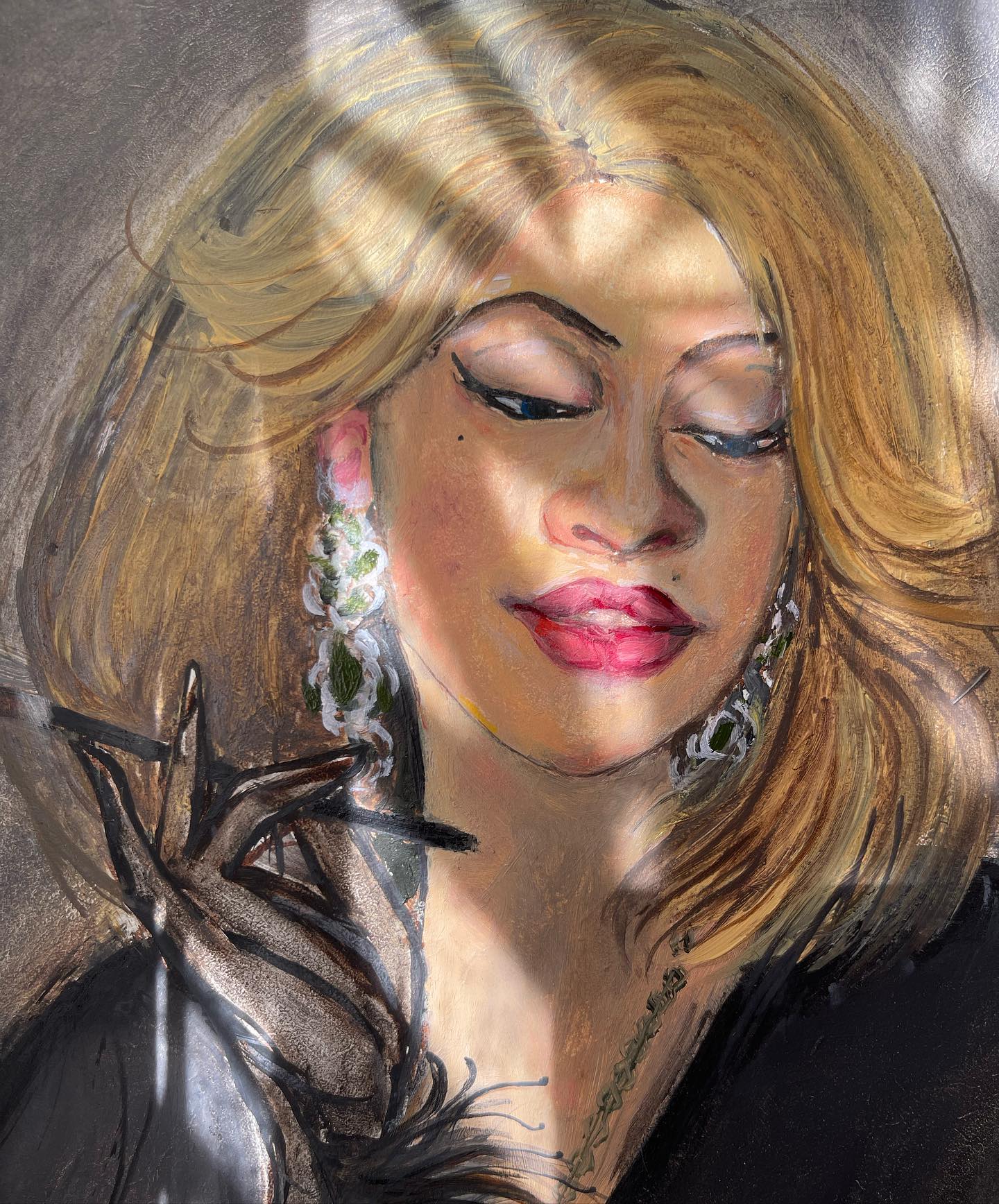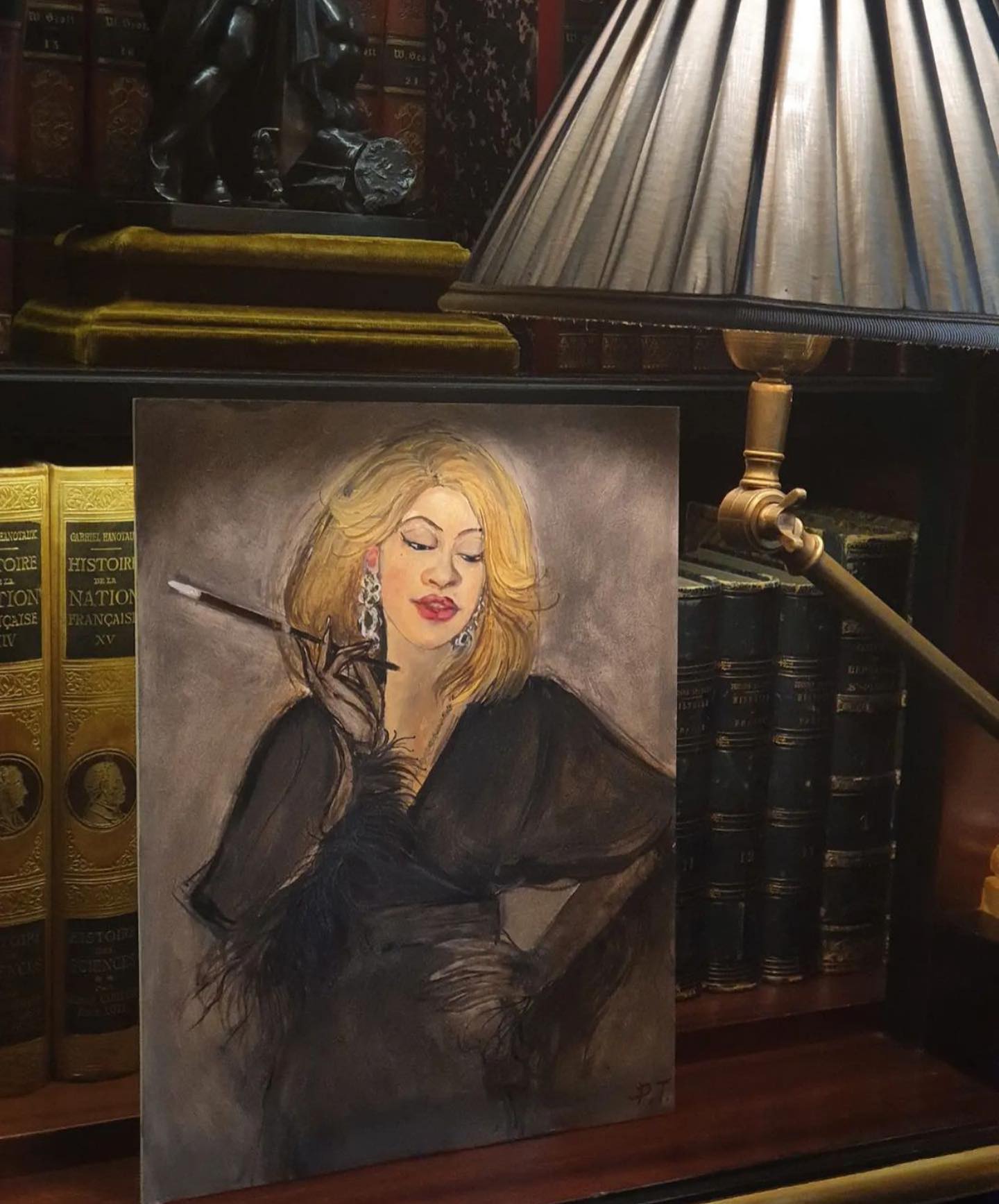 The artist's free, expressive brushstrokes, combined with a restrained color palette, create an image that is both modern and reminiscent of portraits from Hollywood's Golden Age. The use of light and shadow gives volume and life to the figure, while the pose and expression suggest a quiet confidence.