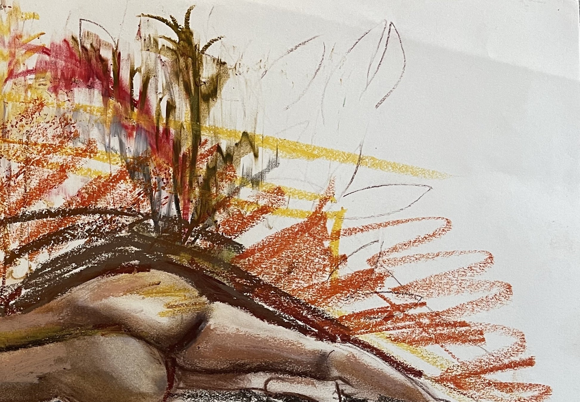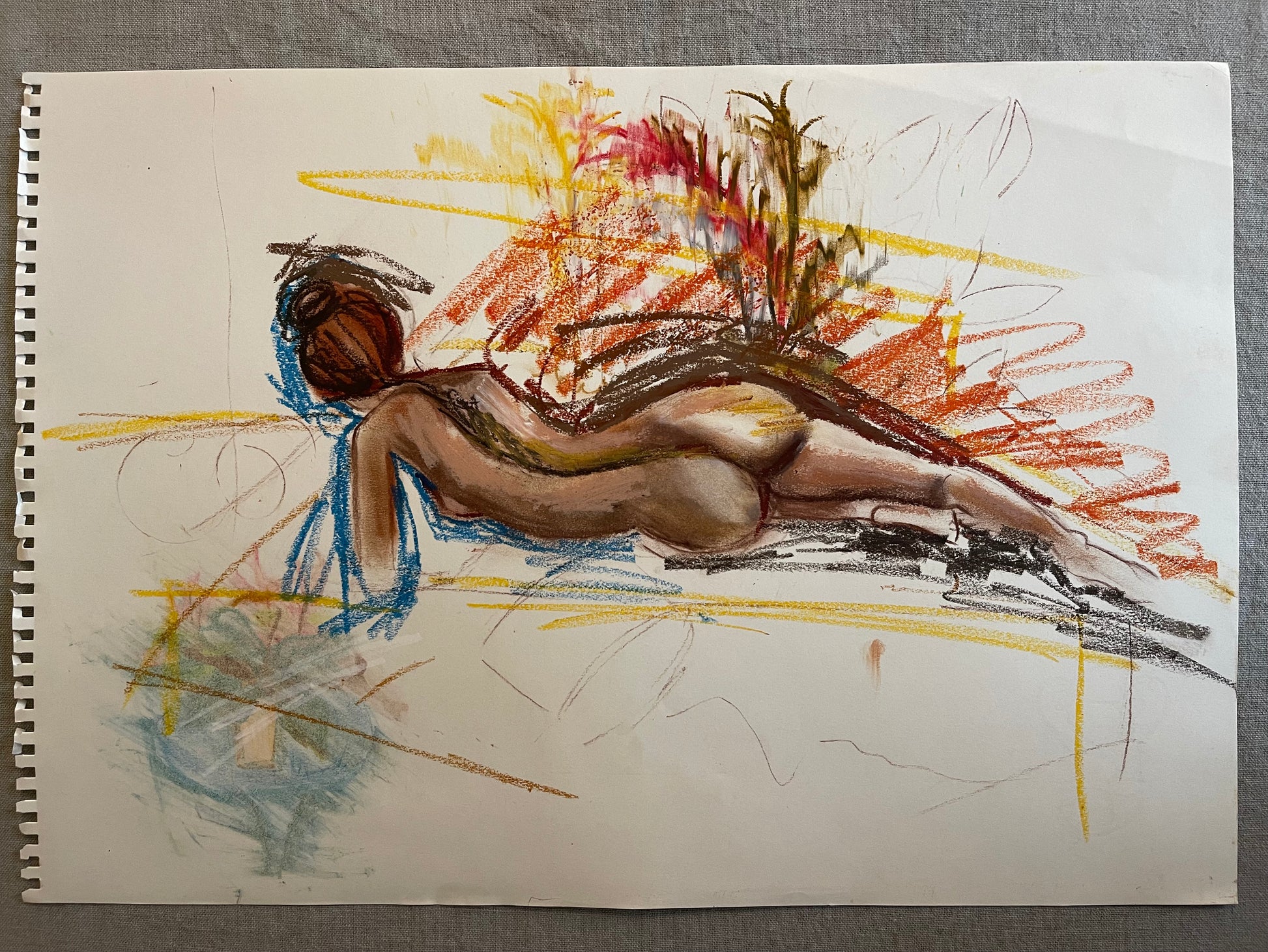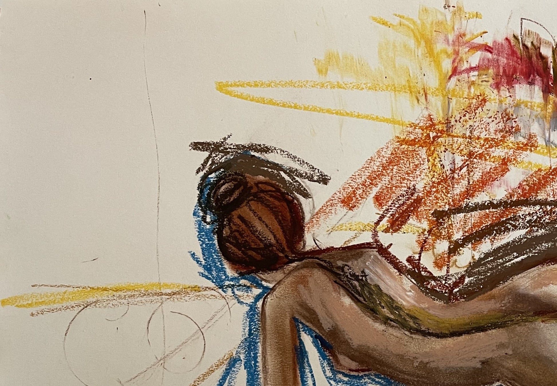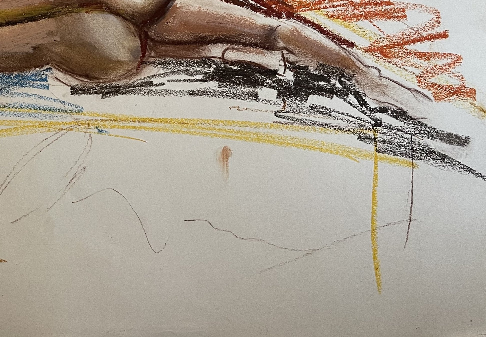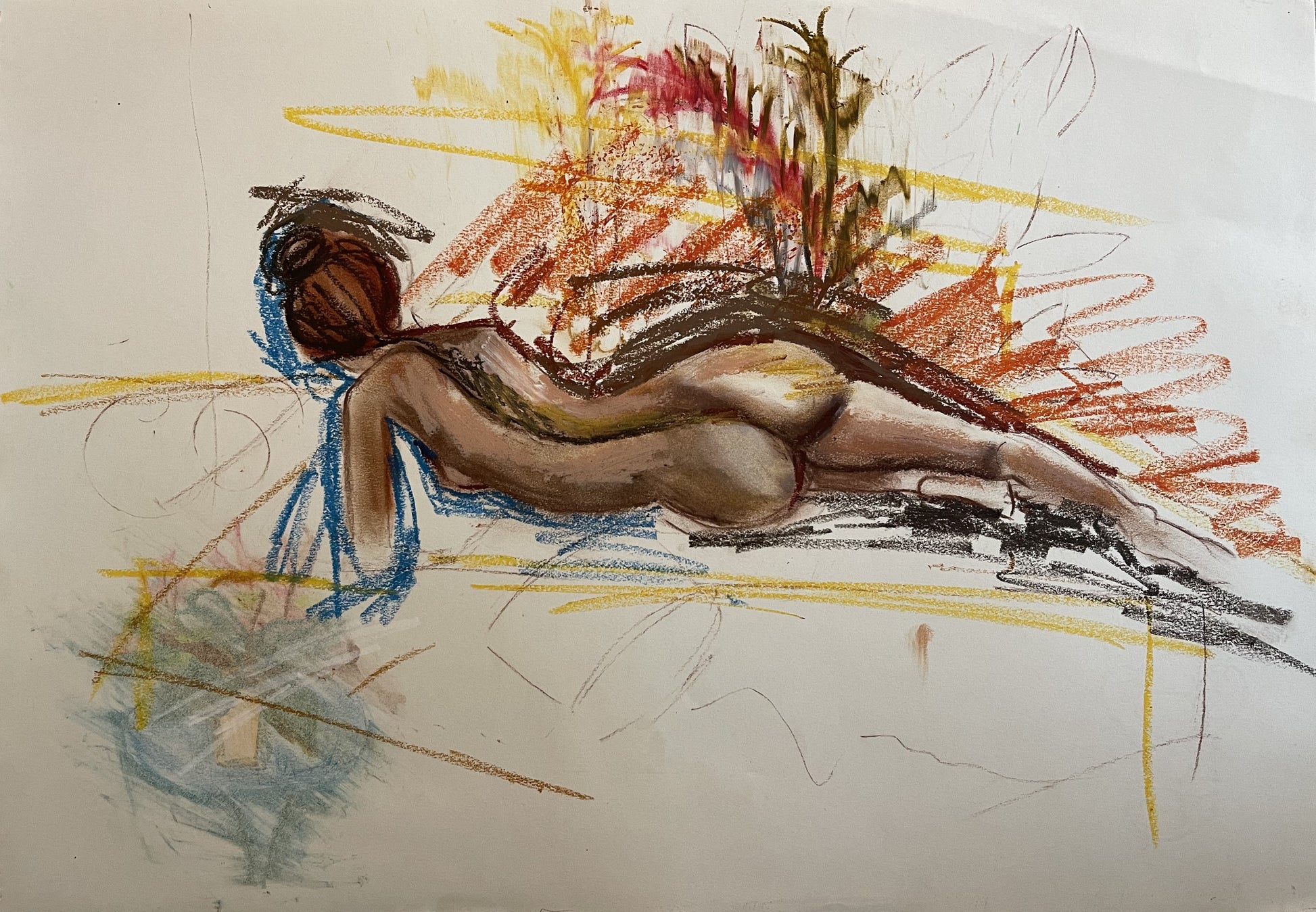 "Embers of Serenity" is an expressive blend of form and color, created with vibrant pastels and dynamic strokes. The reclining figure, rendered with soft shading, embodies a sense of peaceful surrender, while the surrounding bursts of color reflect the inner energy of the subject. The use of mixed media and the contrast between the calm figure and the energetic backdrop invite a dialogue between stillness and movement.