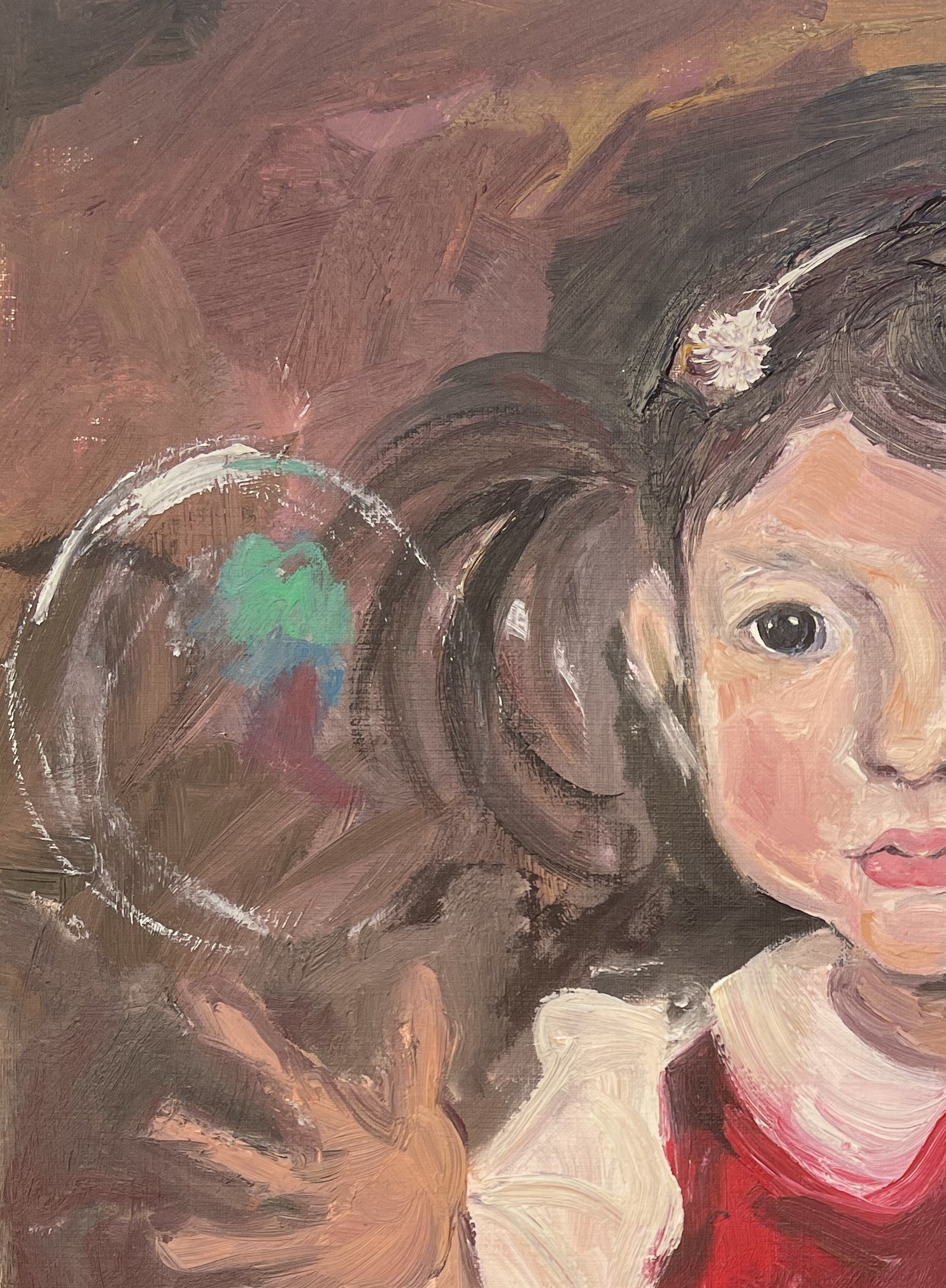The child's expression, imbued with pure curiosity, is a mirror of our own quest for beauty in the ephemeral details of life. The bubble, with its iridescent reflections, is a metaphor for the delicate soul and the dreams that color our existence from the first breath.