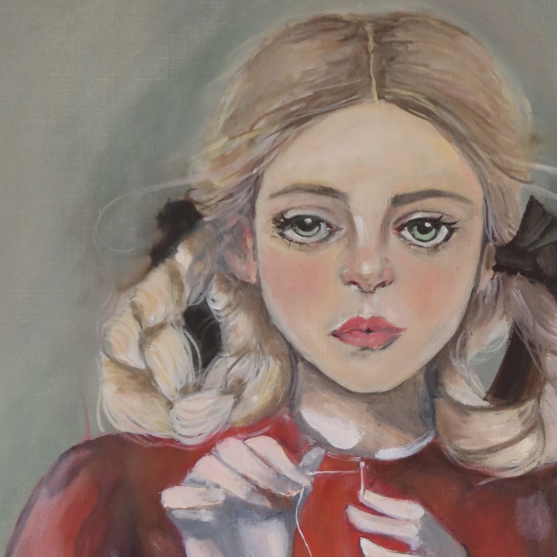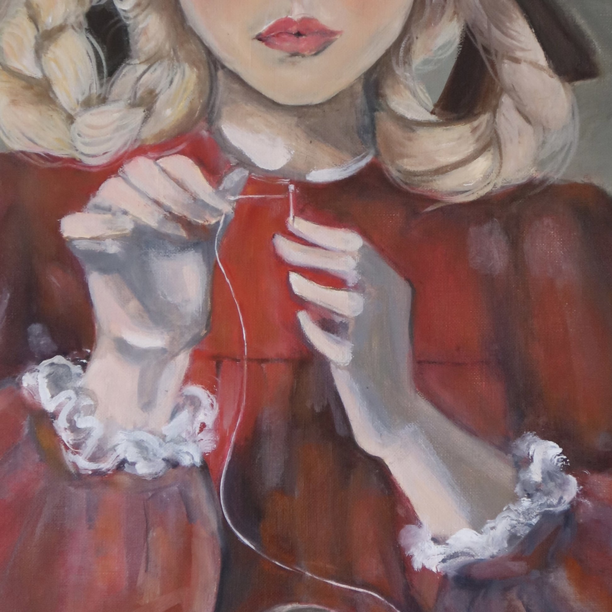 In a space where time seems suspended, a young girl, with almost unreal features, perched on the threshold of maturity, delicately holds a needle, evoking a deep introspection, illuminated by the soft and pale glow of her own reflections. Her distant gaze seems to seek answers to ancient and timeless questions.