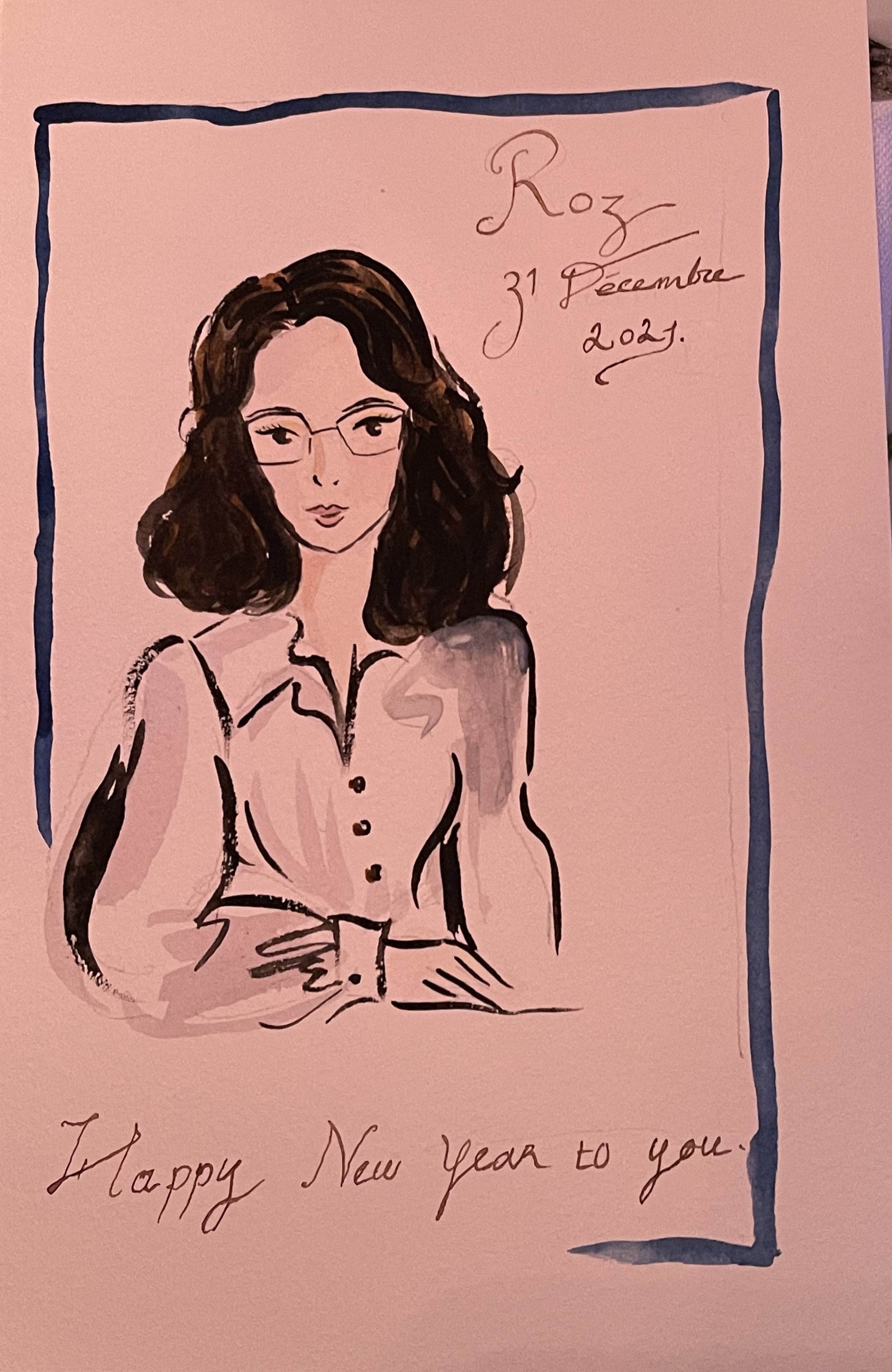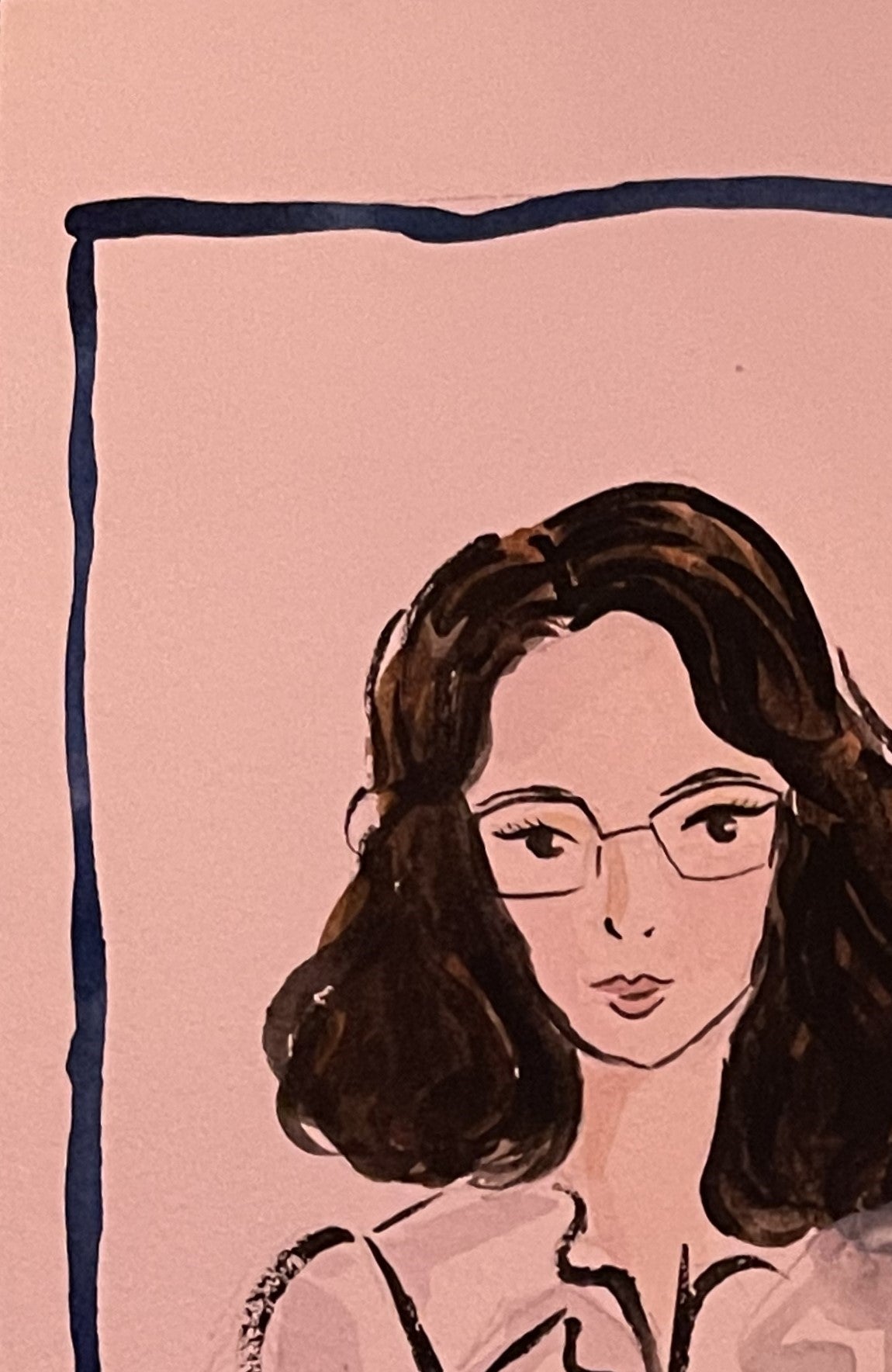 Crafted with ink and watercolor, this illustration exudes elegance and refinement. The portrait highlights the subject’s poised and intellectual nature, delicately outlined with fluid brushstrokes that evoke a sense of timelessness. The gentle washes of color enhance the minimalist design, while the personalized calligraphy adds an intimate touch.