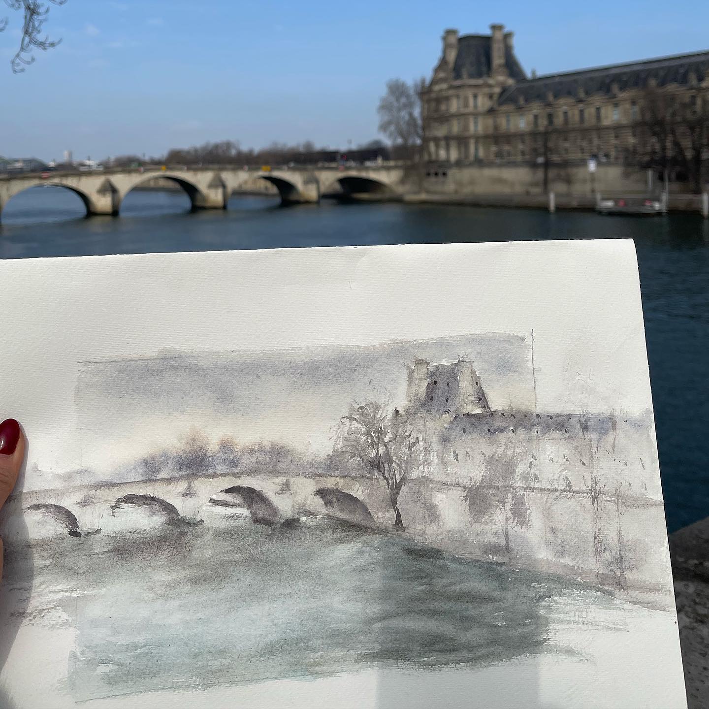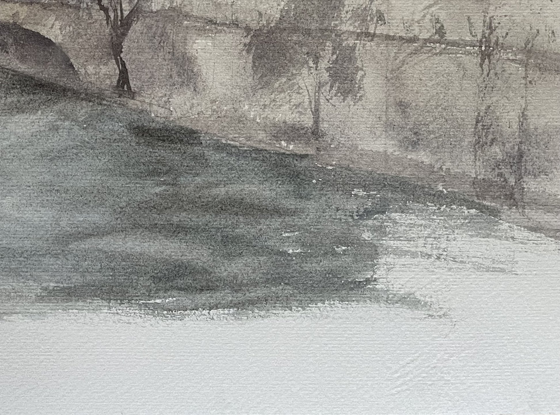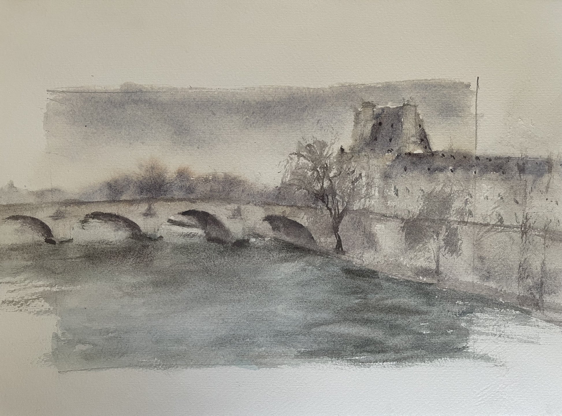 The artist's watercolor technique captures the subtlety of the dawn spreading over the Seine, with hues that reflect the early morning sky and the darkness that begins to recede, evoking the calm of the river and the nobility of the surrounding structures , engulfed in the emerging shadows. The bridge and water blend into a harmony of pastel colors, capturing the fleeting moment when night gives way to day.