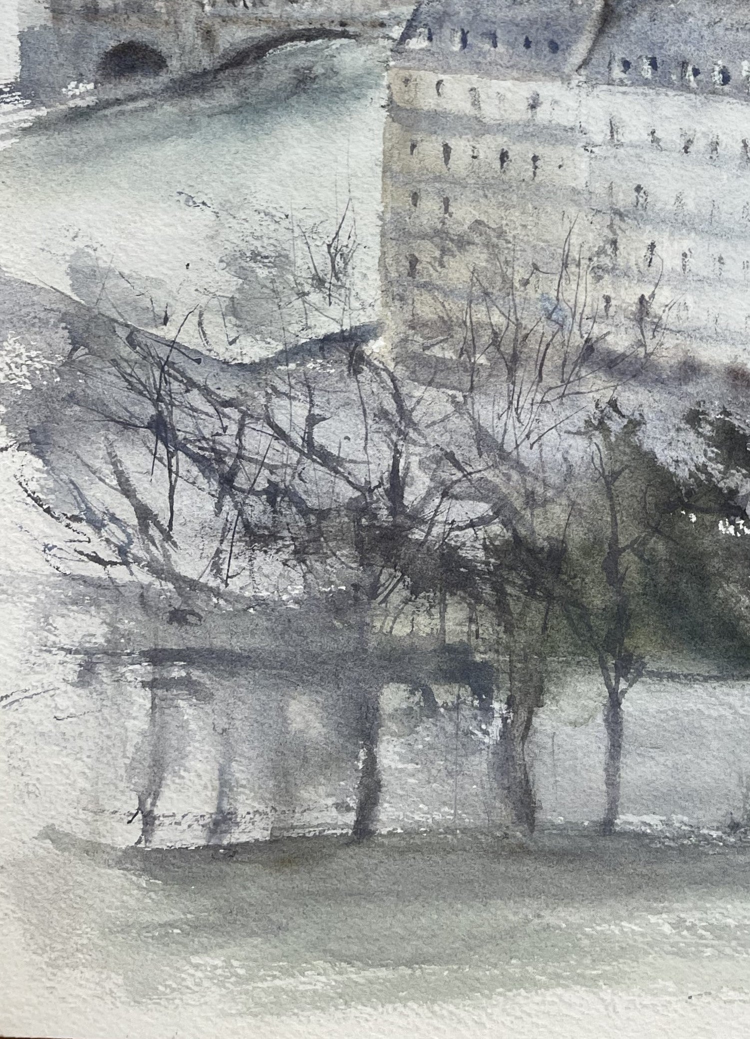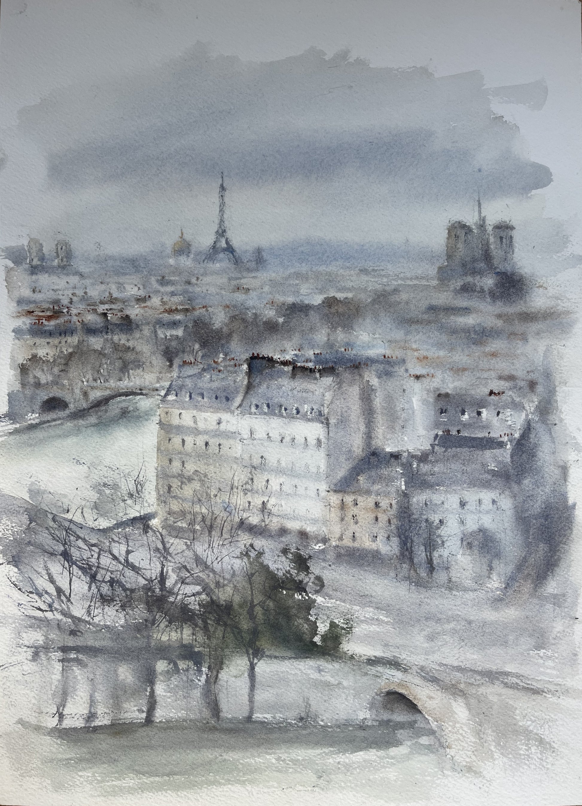 Panicha’s technique of using light washes and delicate brushwork allows the architectural elements to blend harmoniously with the overcast sky, emphasizing a spiritual connection between the city and its ever-changing weather. The subtle layering of tones creates depth while maintaining a sense of tranquility and reflection. This piece invites viewers to feel the calm and reflective mood of Paris as seen from above, offering a peaceful moment amidst the city's timeless beauty.