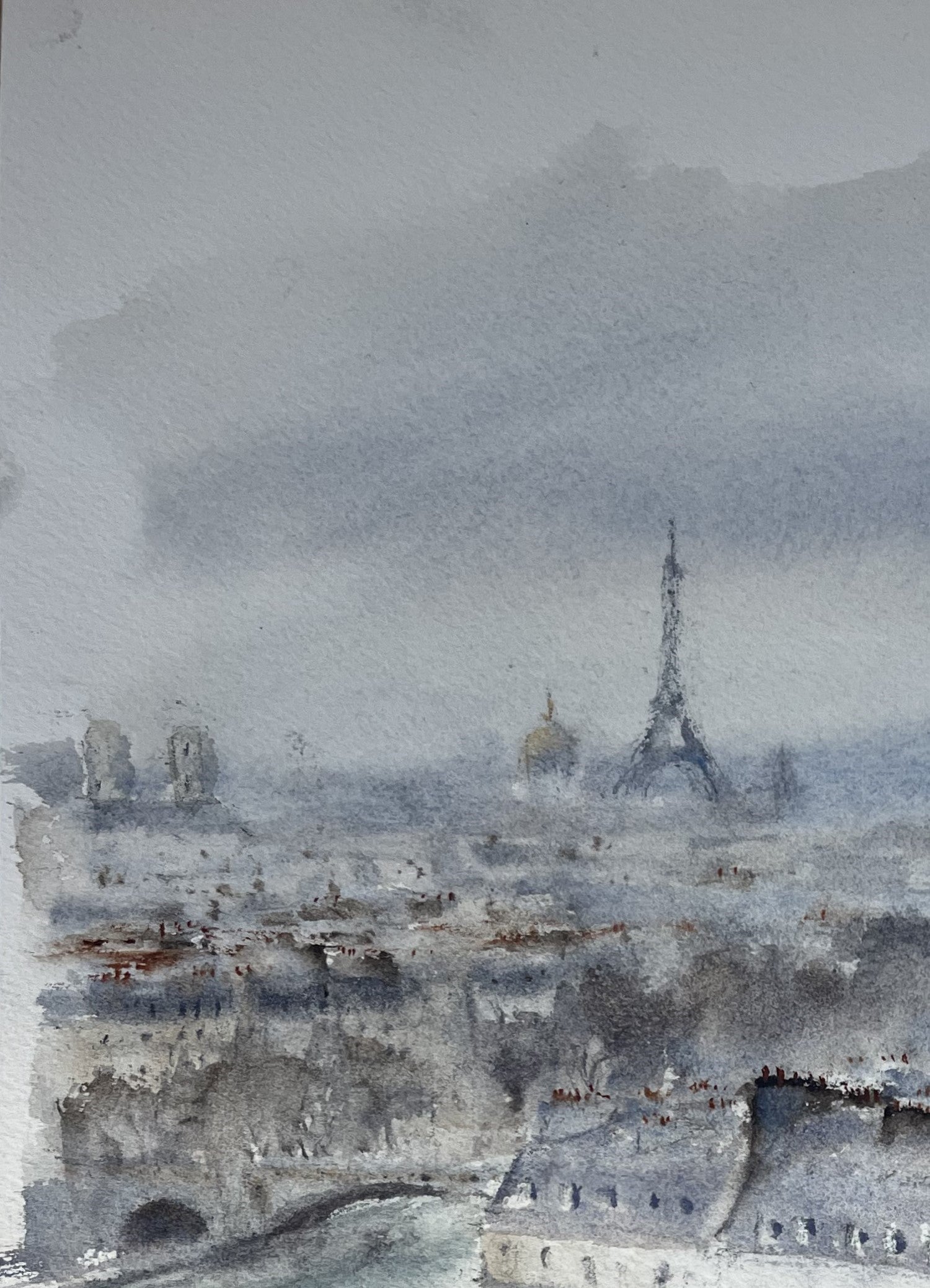 "Paris Through the Mist" is an evocative watercolor capturing the iconic cityscape from the perspective of Bonnie Restaurant.