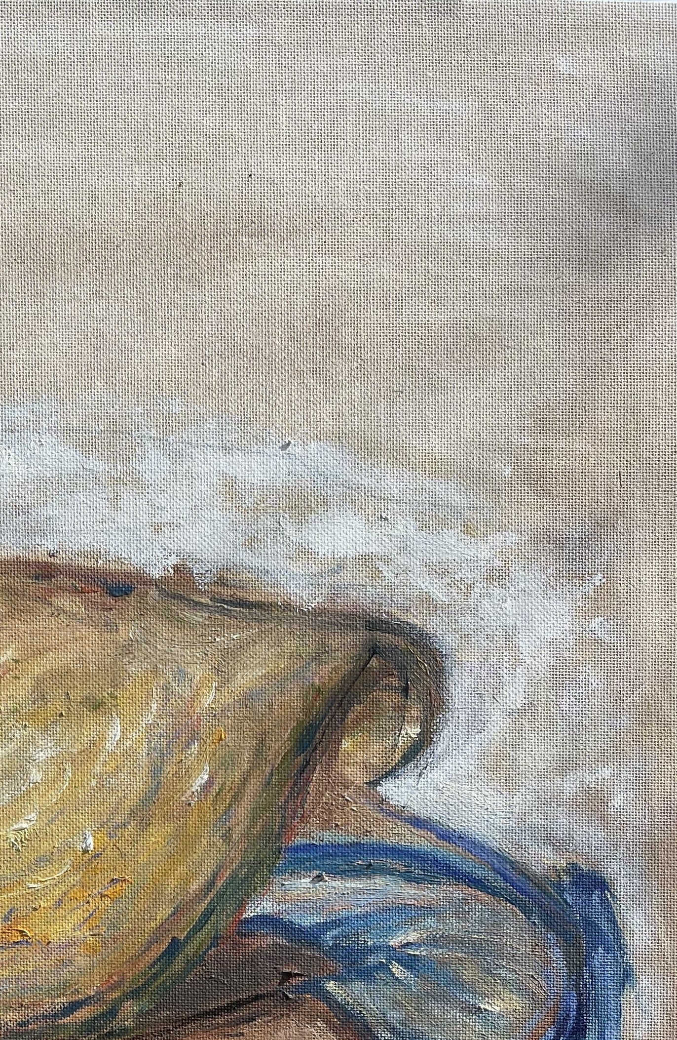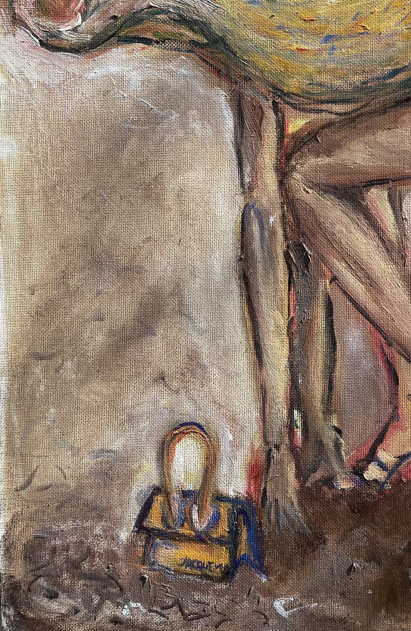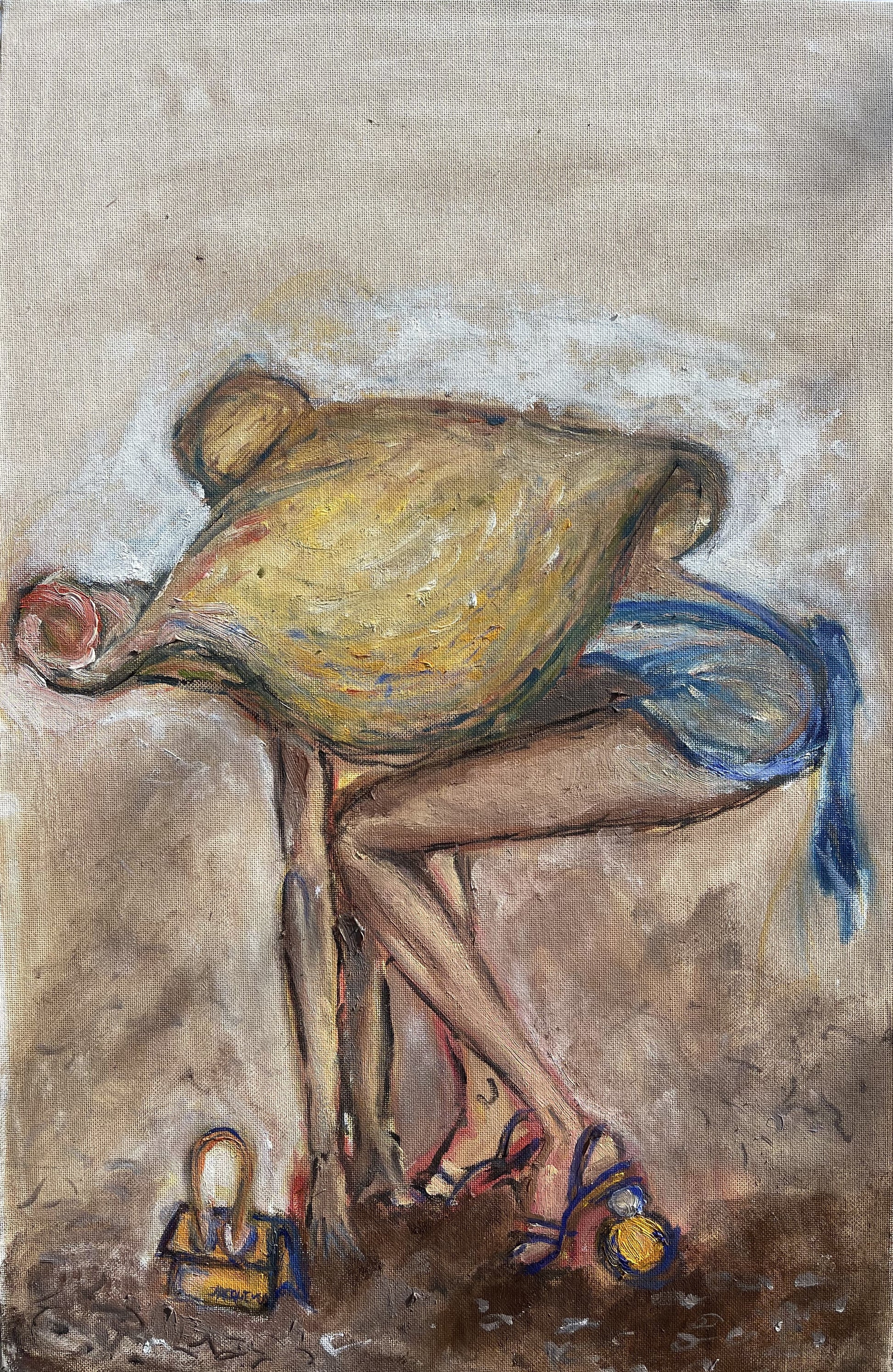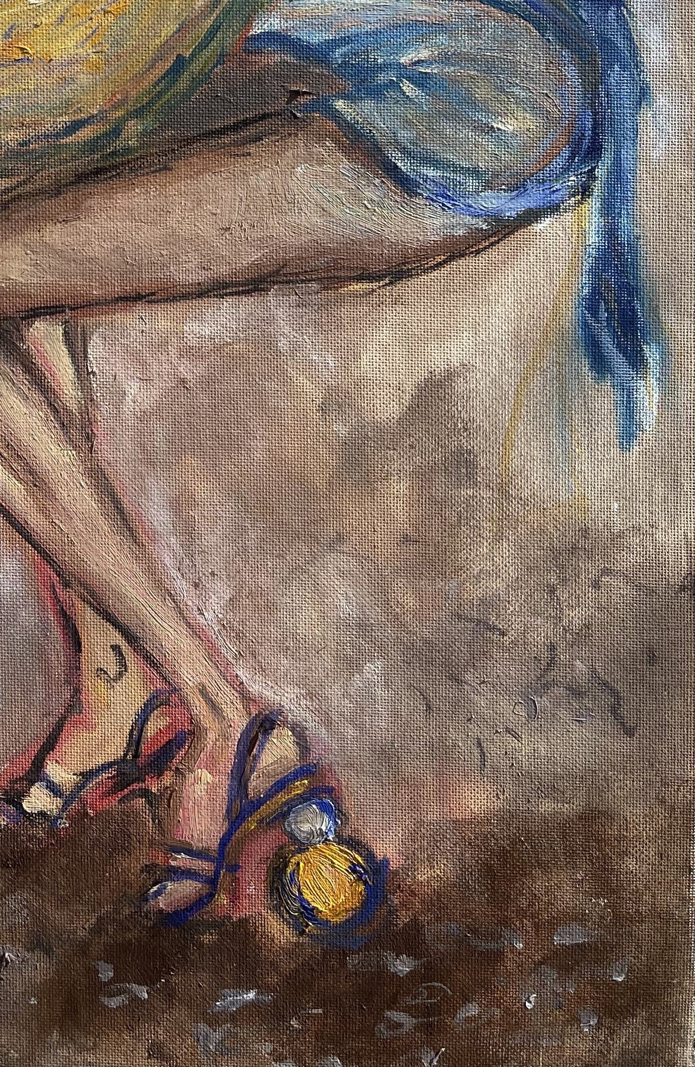 The artist, with her rich color palette and expressive brushstrokes, creates a visual harmony that celebrates beauty in restraint. The oil technique allows for depth and texture that brings the image to life, highlighting the elegance of the moment.