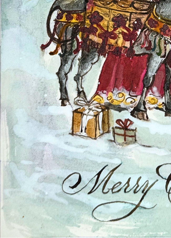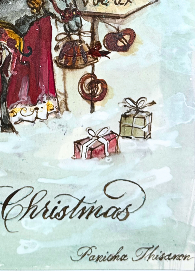 In this charming and intricately detailed mixed-media watercolor painting, Panicha Thisanon reimagines an ancient figure from winter folklore: an elegant and mysterious wish-bearer, traveling through a snowy landscape accompanied by his donkey laden with gifts. Dressed in a purple cloak and a gold-embellished hat, he seems to have stepped out of a tale from long ago, like a messenger from a time when the seasons were magical and gestures imbued with meaning.