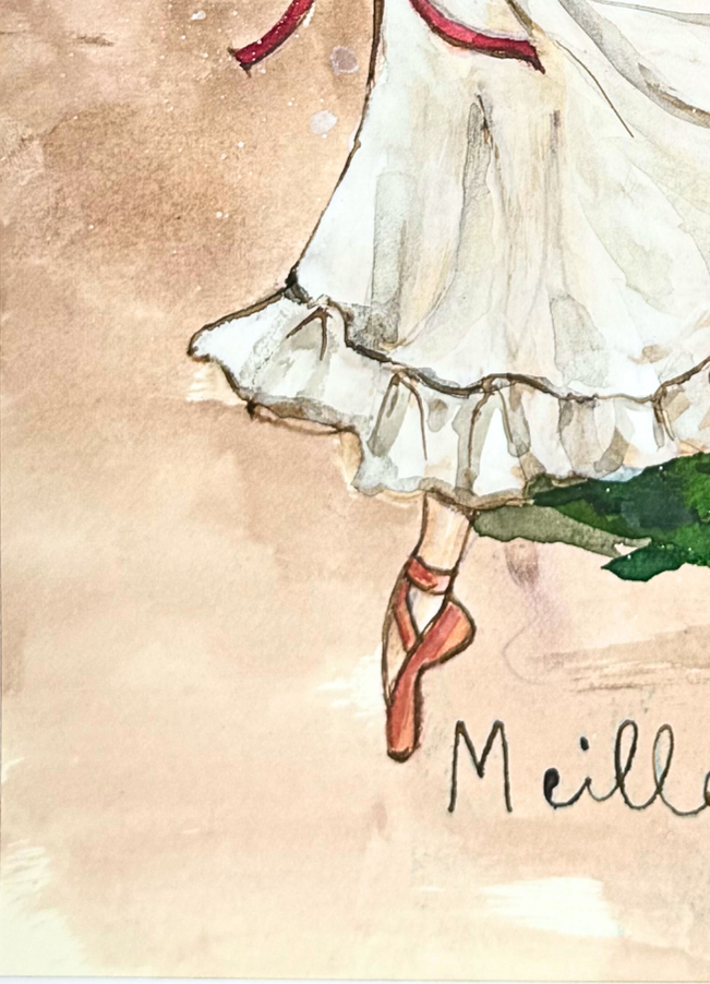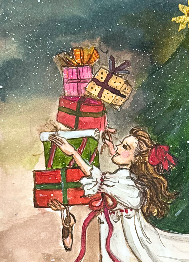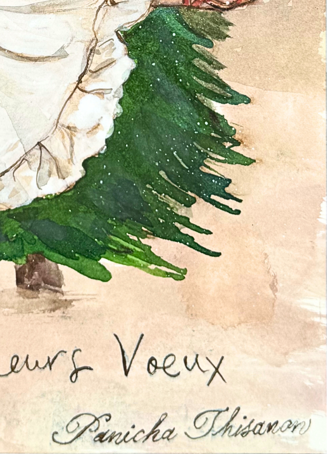 In this mixed-media work based on delicate and luminous watercolors, Panicha Thisanon imagines a young dancer carried by the magic of Christmas. Suspended in a graceful movement, she rises as if the winter wind were offering her another step toward the light. Her white dress with its airy ruffles swirls around her, transforming her gesture into a silent choreography.